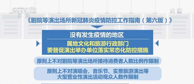 《剧院等演出场所新冠肺炎疫情防控工作指南(第六版)》明确,没有发生疫情的地区,属地文化和旅游行政部门要督促演出举办单位落实常态化防控措施,原则上不对剧院等演出场所接待消费者人数比例作限制,原则上不对演唱会、音乐节、实景旅游演出等大型营业性演出活动观众人数作限制。