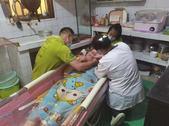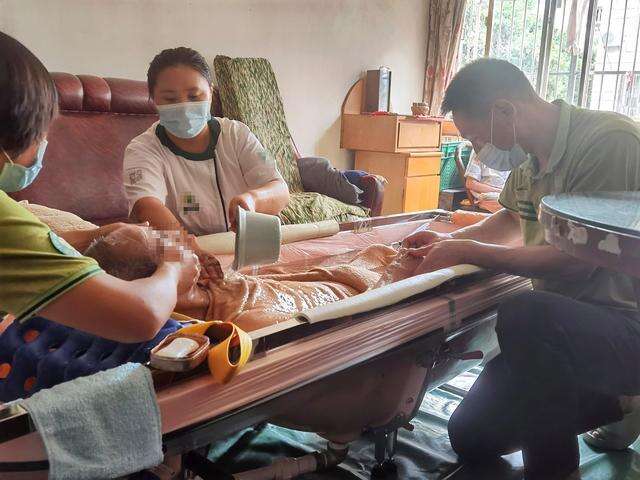 直到去年,镇政府采购了一家企业提供的助浴服务,陈耀娟获得了一个免费名额。包括金启峰在内的两名助浴师和护士王玉笑组成团队,上门为她洗澡。