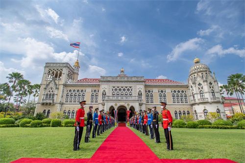 习近平主席抵达总理府时,巴育热情迎接。泰国总理府高官、最高司令及陆、海、空军司令等列队欢迎。仪仗队整齐排列,行注目礼。
