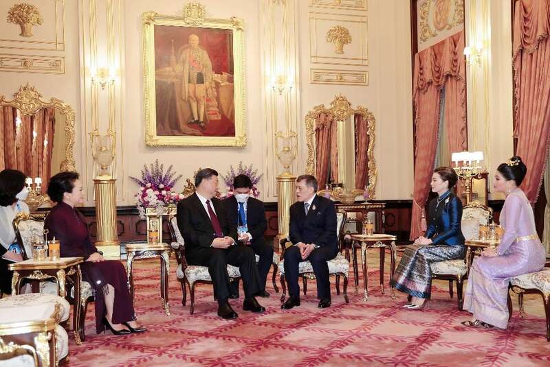 当地时间11月18日晚,习近平在曼谷大王宫会见泰国国王哇集拉隆功和王后素提达。习近平和彭丽媛同哇集拉隆功、素提达及希里婉瓦丽公主合影留念,亲切交谈。