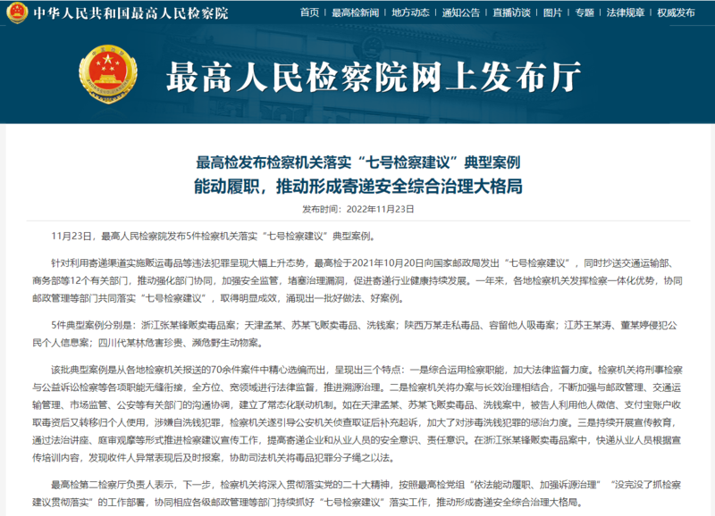11月23日,最高人民检察院发布5件检察机关落实“七号检察建议”典型案例。“七号检察建议”是最高检针对利用寄递渠道实施贩运毒品等违法犯罪呈现大幅上升态势,于2021年10月20日向国家邮政局发出检察建议,同时抄送交通运输部、商务部等12个有关部门,推动强化部门协同,加强安全监管,堵塞治理漏洞,促进寄递行业健康持续发展。一年来,各地检察机关发挥检察一体化优势,协同邮政管理等部门共同落实“七号检察建议”,取得明显成效。