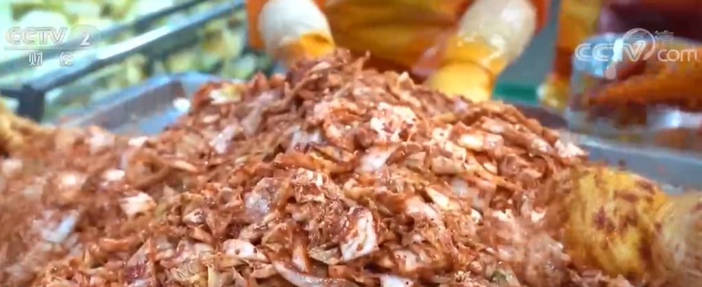 山东青岛某食品公司泡菜加工车间负责人 崔千龙:近期我们的订单比较多,现在正在加工的属于(出口)韩国的,从口味上来讲比(出口)日本的稍微辣一些,现在我们的生产量平均每天三十七、八吨。