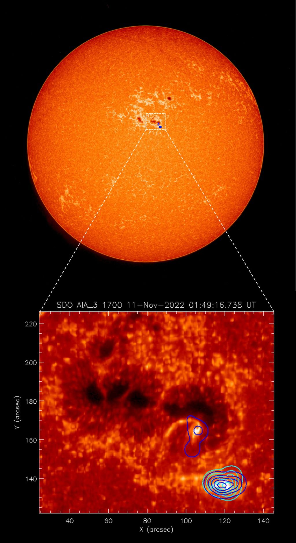 △峰值期间的HXI 25-30 keV硬X射线源(等值线)叠加在SDO/AIA 1700 Å图像上。