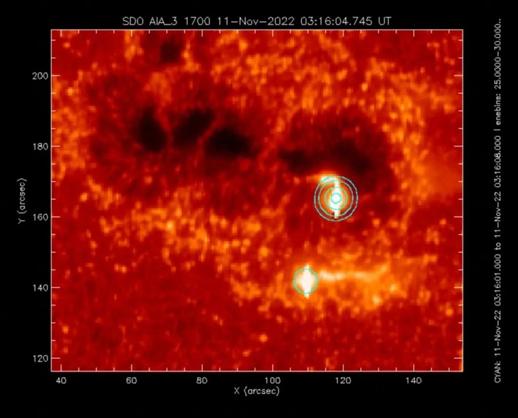 此次发布的“硬X射线成像仪”首图是对今年11月11日01时(世界时)爆发的一个M级耀斑的成像,当时该成像仪开机仅20天。该图像尚未进行光栅定标,位置也仅作平移对齐,但图像和太阳自转轴的倾角以及平台抖动带来的影响等均已修正。从该图中可以看出经典的双足点源结构,且其中一个在高能具有精细的双源结构。