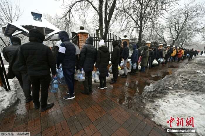 图为当地时间11月24日,基辅民众排队等待进入当地一公园打水。