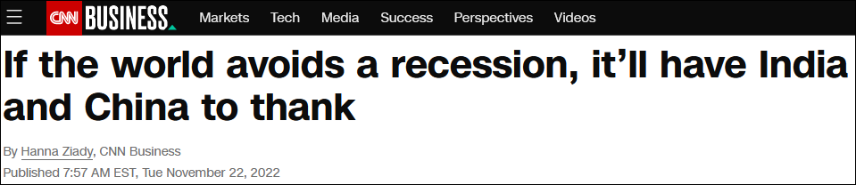 当地时间11月22日,美国有线电视新闻网(CNN)援引经济合作与发展组织(经合组织,OECD)的最新预测数据,强调亚洲地区经济体对于世界经济的重要作用,标题写道:“如果世界能避免经济衰退,那需要感谢中国和印度。”