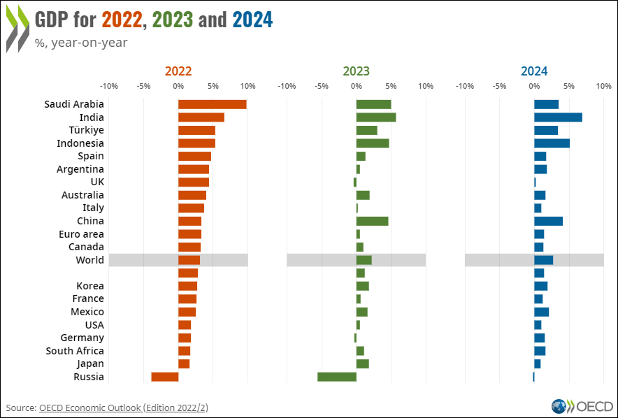 根据经合组织的预测,2022年全球经济增速将为3.1%,2023年将进一步放缓至2.2%,这比国际货币基金组织(IMF)上个月预测3.2%和2.7%的今明两年全球经济增速更为悲观。不过,经合组织并未预测世界经济将出现衰退。