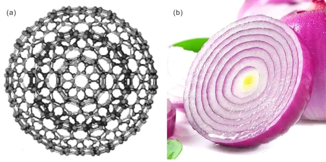 “碳洋葱”是一种巨型富勒烯,由若干层同心球状的石墨壳层嵌套而成,因其与洋葱具有类似的同心多层结构而得名。