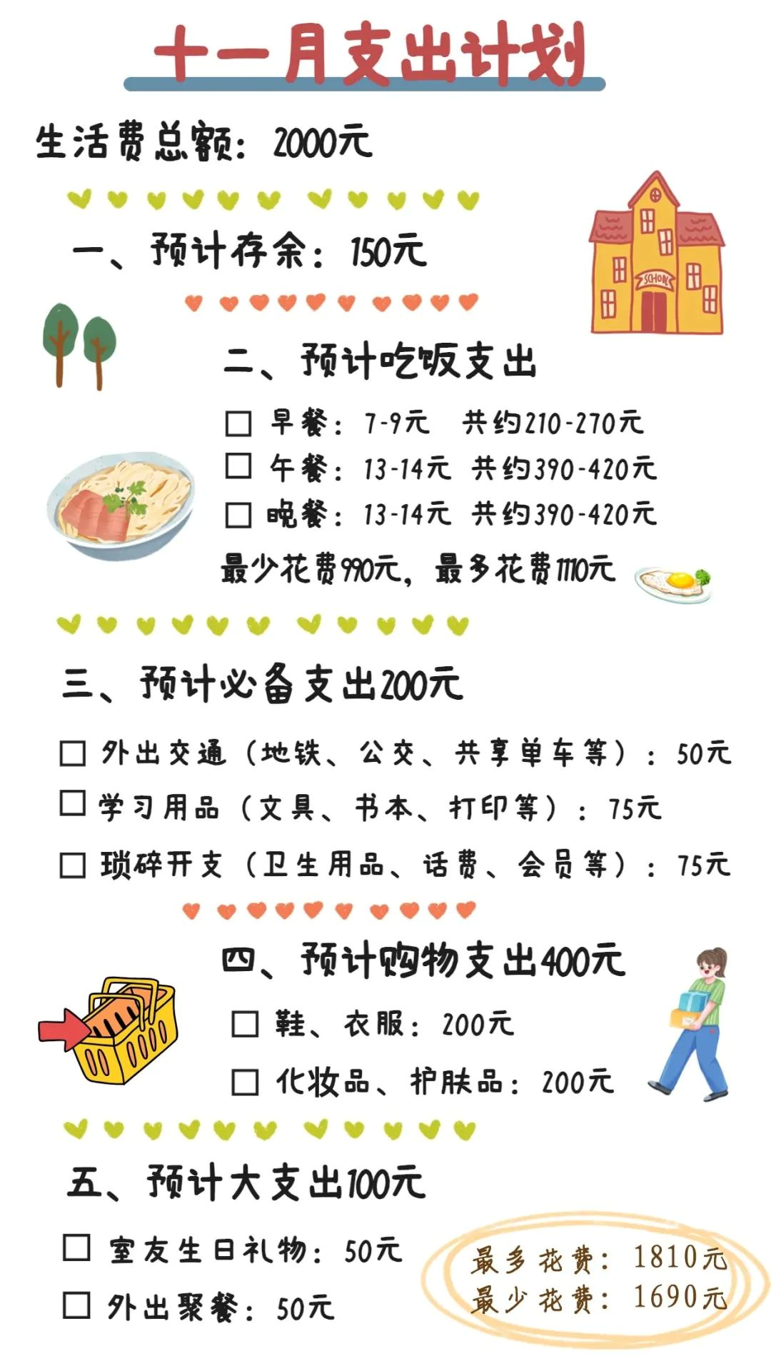 结合个人实际情况合理安排生活费的支出,对每个月的生活费做一个大致的支出规划,做到心里有数,并且定一个省钱的小目标,打造一个自己的“小金库”,以备不时之需。