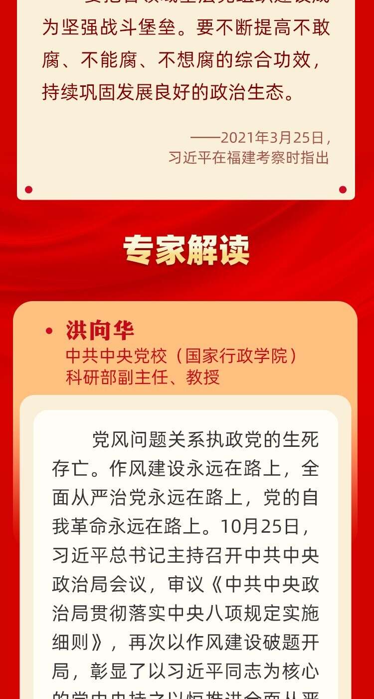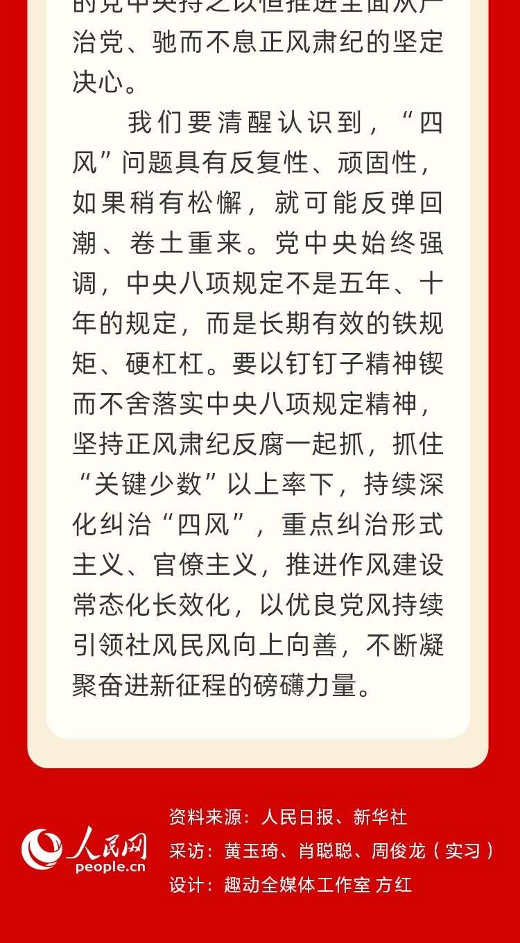 2012年12月4日,中共中央政治局会议审议通过了关于改进工作作风、密切联系群众的八项规定。十年来,以习近平同志为核心的党中央把中央八项规定作为加强作风建设的切入点、全面从严治党的突破口,坚持不懈落实中央八项规定精神、驰而不息纠正“四风”,写下作风建设新篇章,开创全面从严治党新局面。人民网推出“风清气正”系列图解并邀请专家进行解读