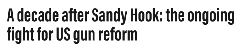 中国日报网12月16日电 2012年12月14日,美国康涅狄格州桑迪·胡克小学(Sandy Hook Elementary School)发生枪击事件,26人遭到枪杀,其中包括20名儿童。这起事件也是美国历史上最严重的校园枪击事件。阿联酋《国家报》网站(The National News)日前刊文称,十年时间过去了,美国在控枪方面的行动依然进展迟缓,数以万计的人命丧枪口之下。