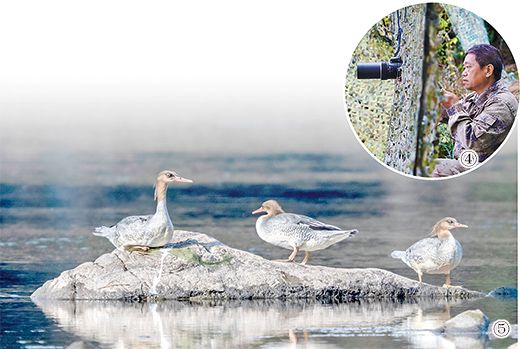 “这几天阴雨,山里很少有人活动,中华秋沙鸭不会受惊吓,是观察的好时机。”肖冬样说,清晨他已经巡过一趟,那时河面朦胧,只拍到了3只鸭子,现在光线更好,这一趟会有更多收获。