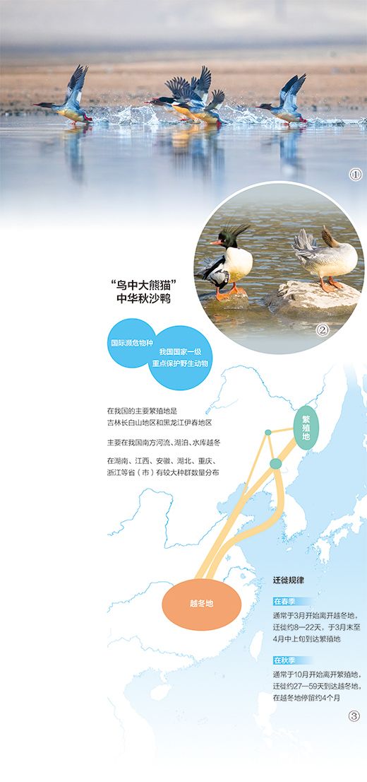 巢于树,栖于水,繁衍生息,南迁北归……中华秋沙鸭繁殖地主要分布于俄罗斯东南部、朝鲜半岛北部,以及我国吉林省长白山地区和黑龙江省伊春地区,每年3月末、4月初,中华秋沙鸭飞回北方,在这里度过长达半年多的繁殖期,再于11月初南迁。中华秋沙鸭越冬地主要在我国的南方河流、湖泊、水库,其中在江西、湖南等地有较大种群数量分布。