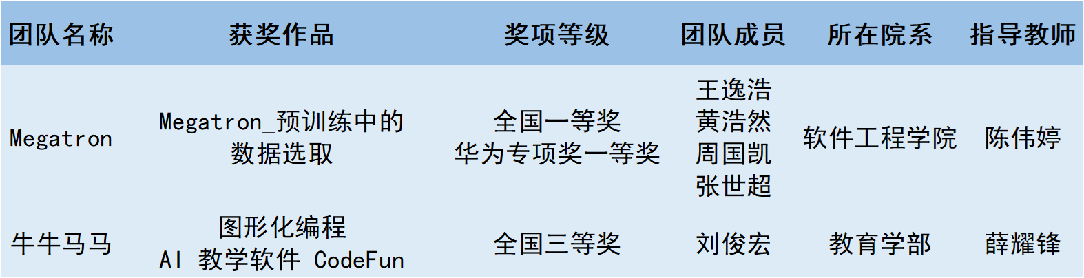 软件工程学院王逸浩团队参赛作品“预训练中的数据选取”获全国一等奖、华为专项奖一等奖“双料奖”。