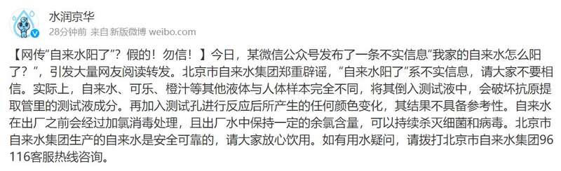 “自来水阳了”?北京市自来水集团辟谣