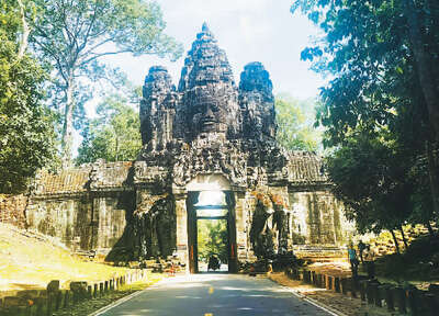 吴哥古迹的胜利门建造于公元13世纪吴哥王朝鼎盛时期。城门四面皆雕刻着巨大的神像,面露端庄而神秘的微笑。穿过胜利门,可以分别到达王宫遗址和茶胶寺。