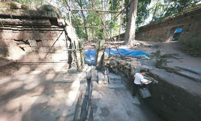 周萨神庙是一座呈平面布局的中小型寺庙,四周散落着4000多块石构件。寺内雕刻十分精美,残损严重但布局相对完整。中国文物专家在周萨神庙工作了10年,深入学习吴哥文明的历史、宗教文化和艺术知识,开展了多项勘察研究工作;在此基础上,采用“原物归位法”对周萨神庙进行复原。10年的“深耕细作”为中国培养出了一支跨学科的吴哥保护修复团队,也为后续茶胶寺修复项目积累了经验。