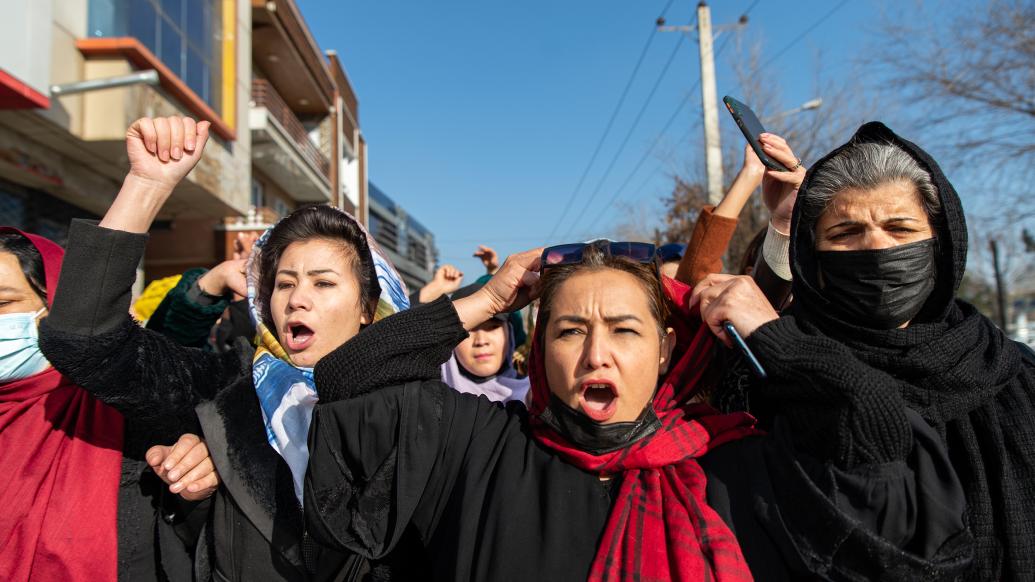 当地时间2022年12月22日,阿富汗喀布尔,阿富汗妇女抗议塔利班禁止妇女接受大学教育的新法令。视觉中国 图