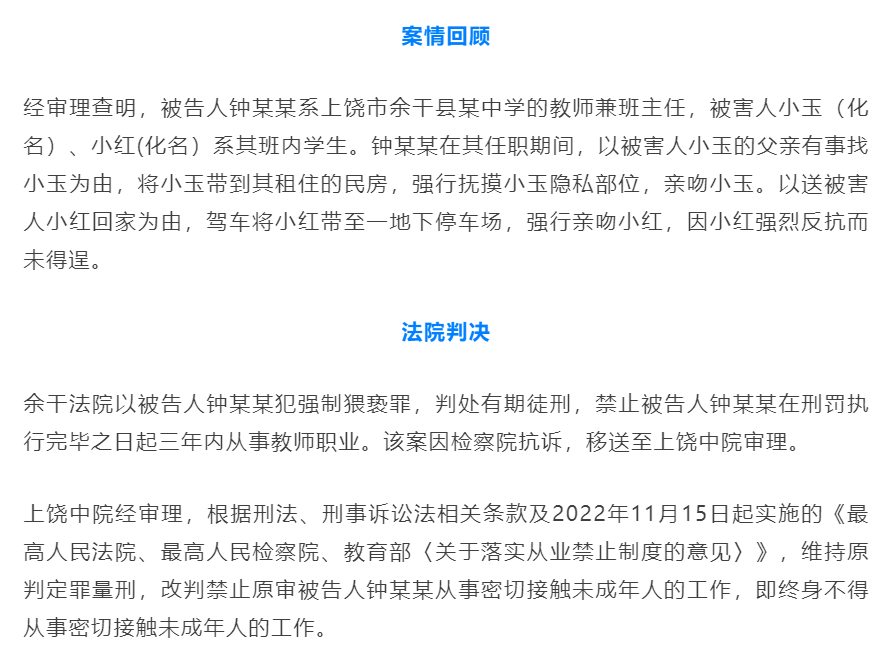 ☞中学班主任猥亵未成年女生获刑,被判终身禁业!近日,江西省上饶市中级人民法院宣判一起学校教师猥亵未成年女学生的刑事案件,在维持一审定罪量刑的同时,对原审被告人钟某某改判禁止从事密切接触未成年人的工作。该案系《最高人民法院、最高人民检察院、教育部〈关于落实从业禁止制度的意见〉》实施以来,上饶市首例对性侵害未成年人的教职人员依法宣告终身禁止从事密切接触未成年人工作的刑事案件。(法治日报)