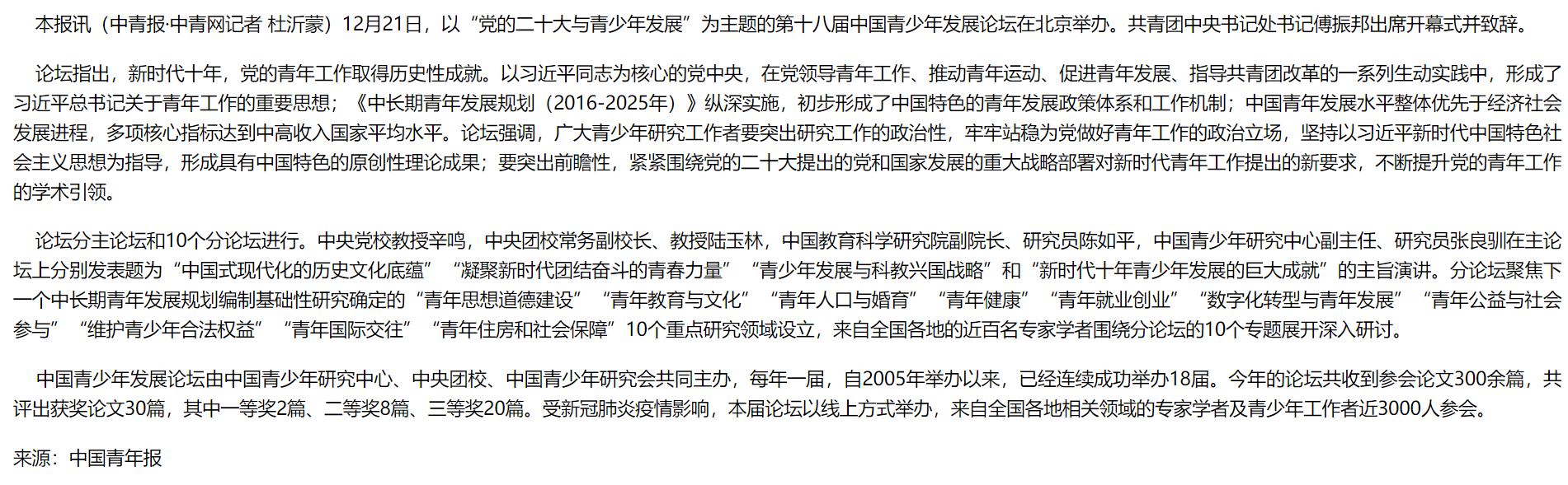 ☞第十八届中国青少年发展论坛举办。近日,以“党的二十大与青少年发展”为主题的第十八届中国青少年发展论坛在北京举办。团中央书记处书记傅振邦出席开幕式并致辞。今年的论坛共收到参会论文300余篇,共评出获奖论文30篇,其中一等奖2篇、二等奖8篇、三等奖20篇。受新冠肺炎疫情影响,本届论坛以线上方式举办,来自全国各地相关领域的专家学者及青少年工作者近3000人参会。(中国青年报)