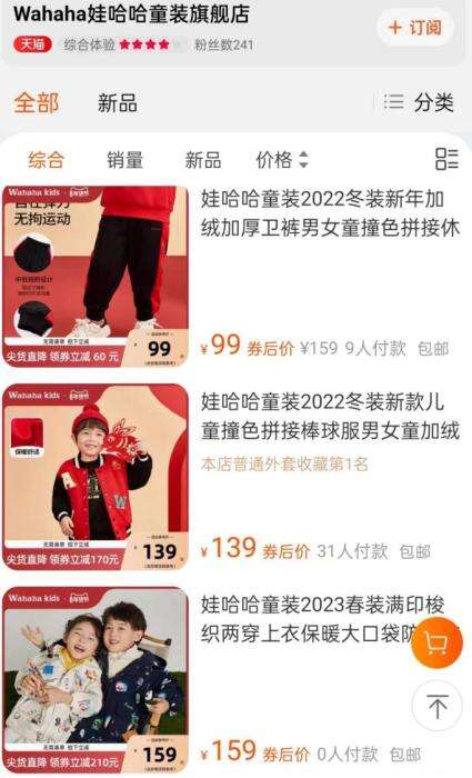 去年年底,娃哈哈童装旗舰店分别在淘宝和抖音上线,并上架了新年系列和春季新品,首批童装服饰范围涵盖外套、卫衣、毛衣、裤装等多个品类,价格在119-559元不等。