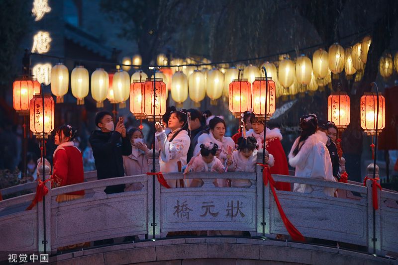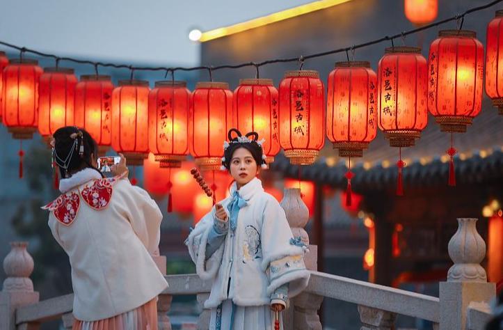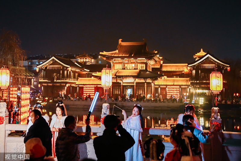 2023年1月11日,河南洛阳,洛邑古城内张灯结彩,年轻游客身穿汉服漫步古城,在热闹氛围中喜迎新春佳节。