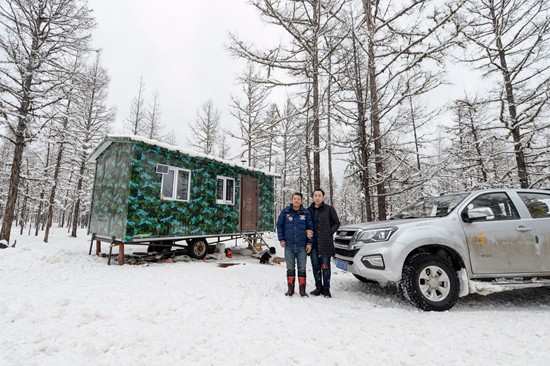 2021年3月10日,内蒙古大兴安岭林区,敖娜(右)与丈夫在位于大兴安岭原始森林腹地的住所外合影。