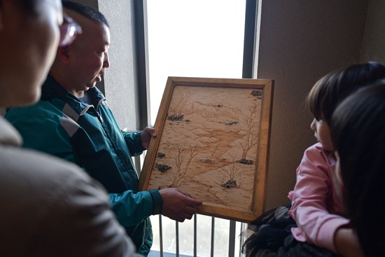 2021年12月1日,北京市通州区,赵一霖向北京的同事介绍自己用桦树皮制作的传统手工艺品。