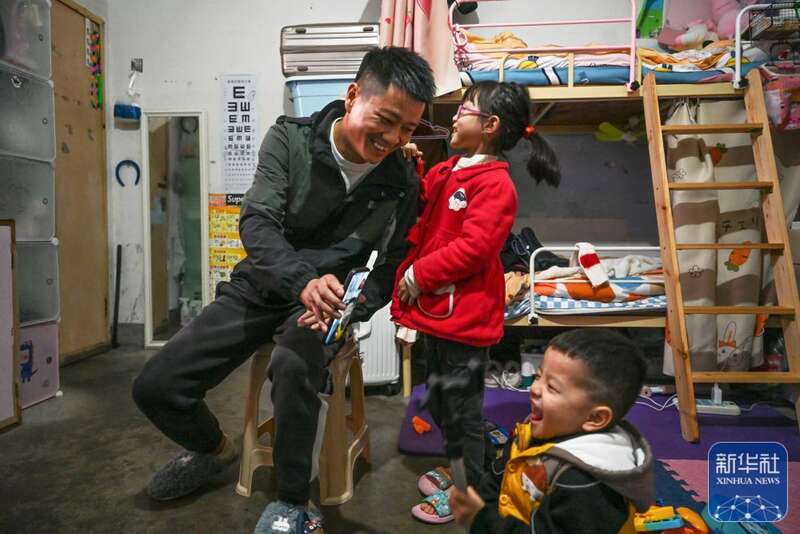 李小铁和孩子们一起与家人视频。新华社记者 周义 摄