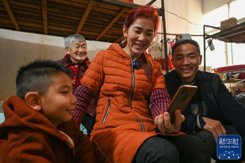 常玉凤一家和女儿通视频电话。新华社记者 周义 摄