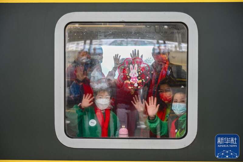 乘坐K1268次列车的乘客在车上挥手。新华社记者 周义 摄