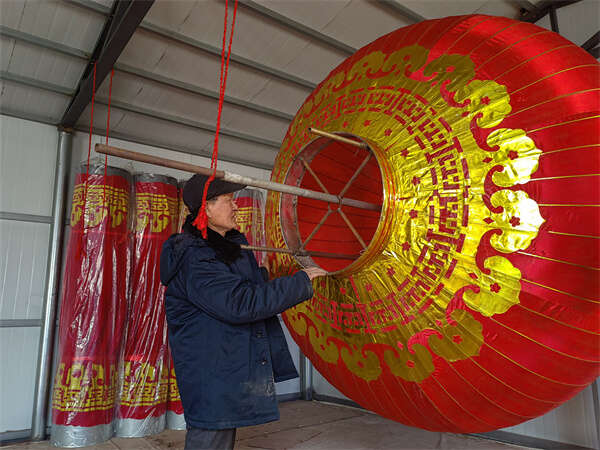 在69岁的宫灯制作手艺人白军平家中,一盏直径6米的超大宫灯已经制作完成,正准备发货。白军平撑起一盏直径2.5米的红色灯笼,仔细调试。他笑呵呵地说:“现在大家都会做普通的红灯笼,我就得不断研究,做一些别人做不来的,才能卖上好价钱。”