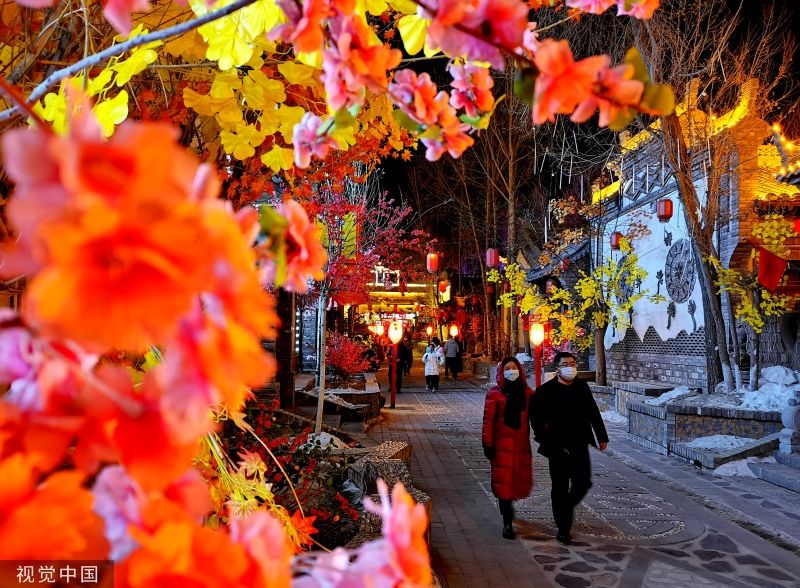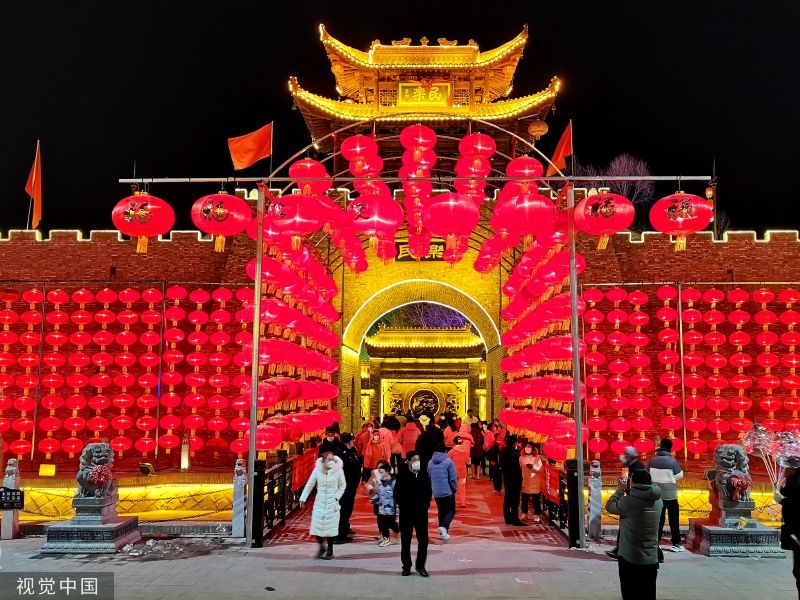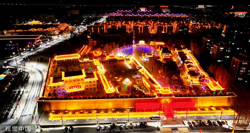 2023年1月29日晚,甘肃张掖,民乐县城北民俗文化村一片流光溢彩,整个景区犹如铺开的一幅缤纷画卷。
