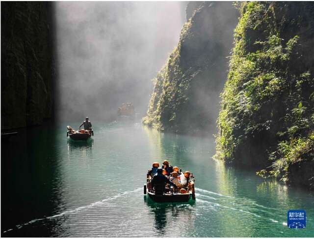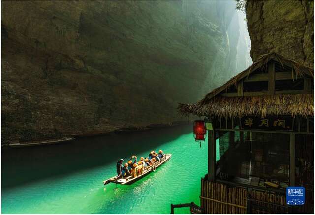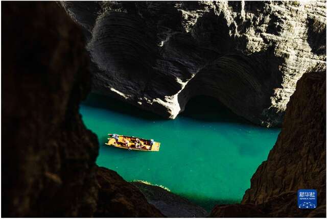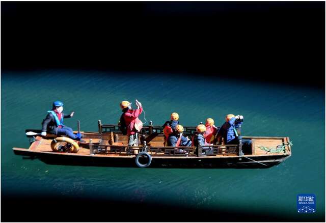 ↑1月28日,游人在鹤峰县屏山旅游景区乘船游玩。新华社发(覃涛 摄)