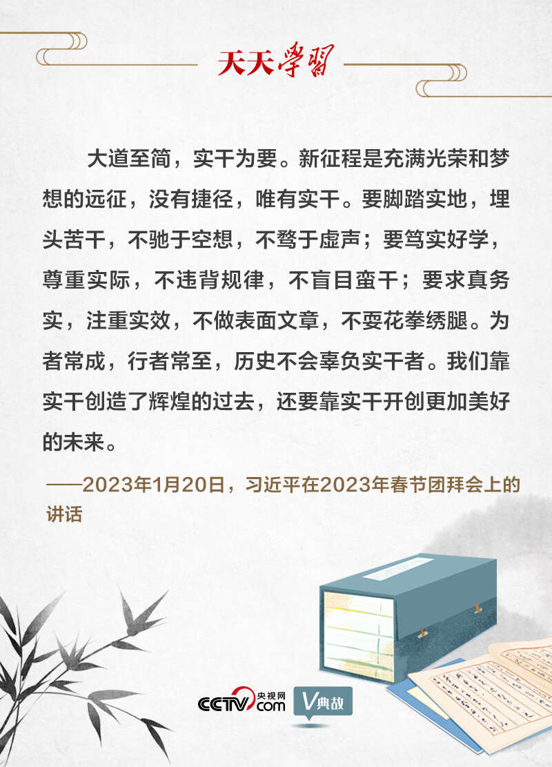 天天学习1月20日举行的2023年春节团拜会上,习近平总书记指出,新征程是充满光荣和梦想的远征,没有捷径,唯有实干。他引用古语“为者常成,行者常至”,发出新春号召:历史不会辜负实干者。我们靠实干创造了辉煌的过去,还要靠实干开创更加美好的未来。