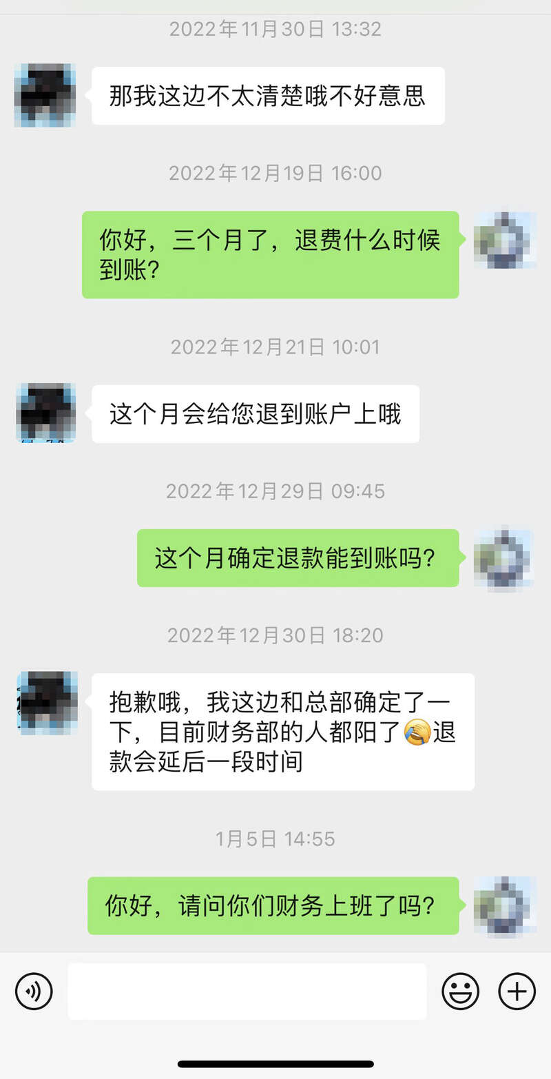 “解约申请上显示,退费时间是申请完成后3个月,等到去年12月并没有打给我。”蔡先生说,自己2023年1月再次询问相关负责人退费进展,仍未得到明确回复。其间,他也曾多次向全国12315平台进行反映,寻求调解。