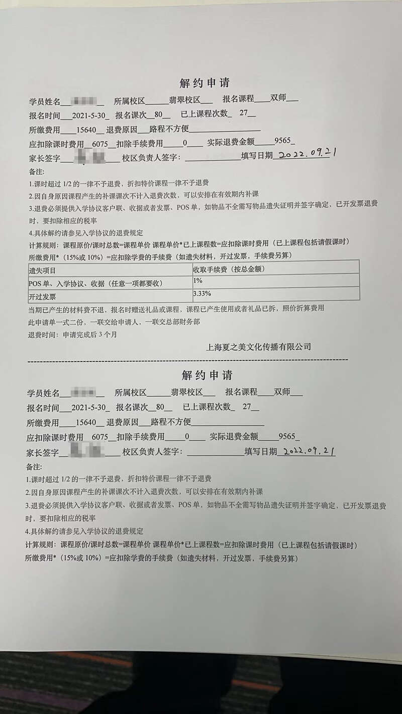 不过,蔡先生表示,这份解约申请单填好发给机构相关负责人后,他并未获得校区负责人签字回复后的版本。