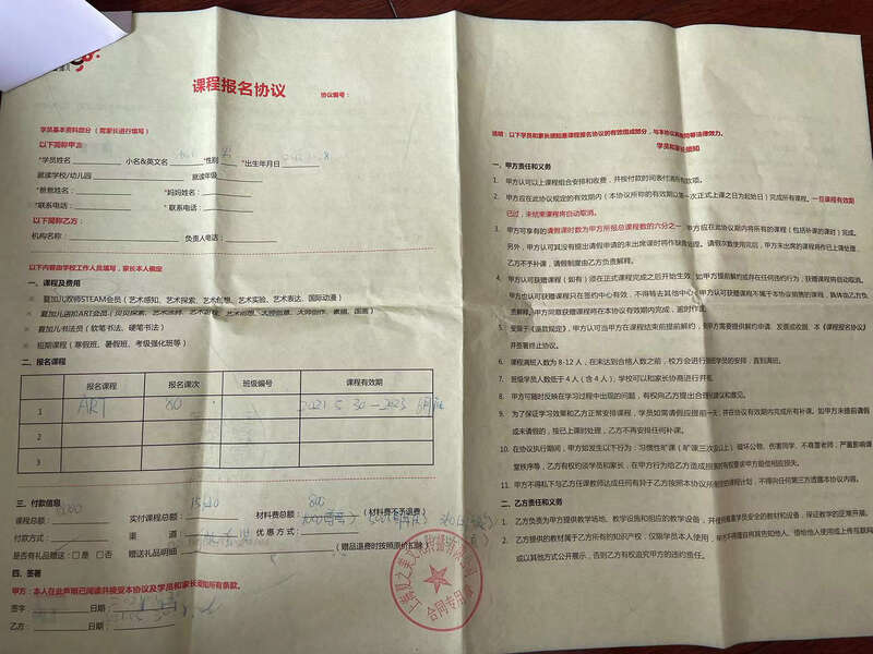 对此,夏加儿艺术总部相关负责人对澎湃新闻(www.thepaper.cn)记者表示,之所以没有签字盖章,是因为疫情期间是在线办理的,就只有家长签字,他们再打印出来,然后做财务申请流程。