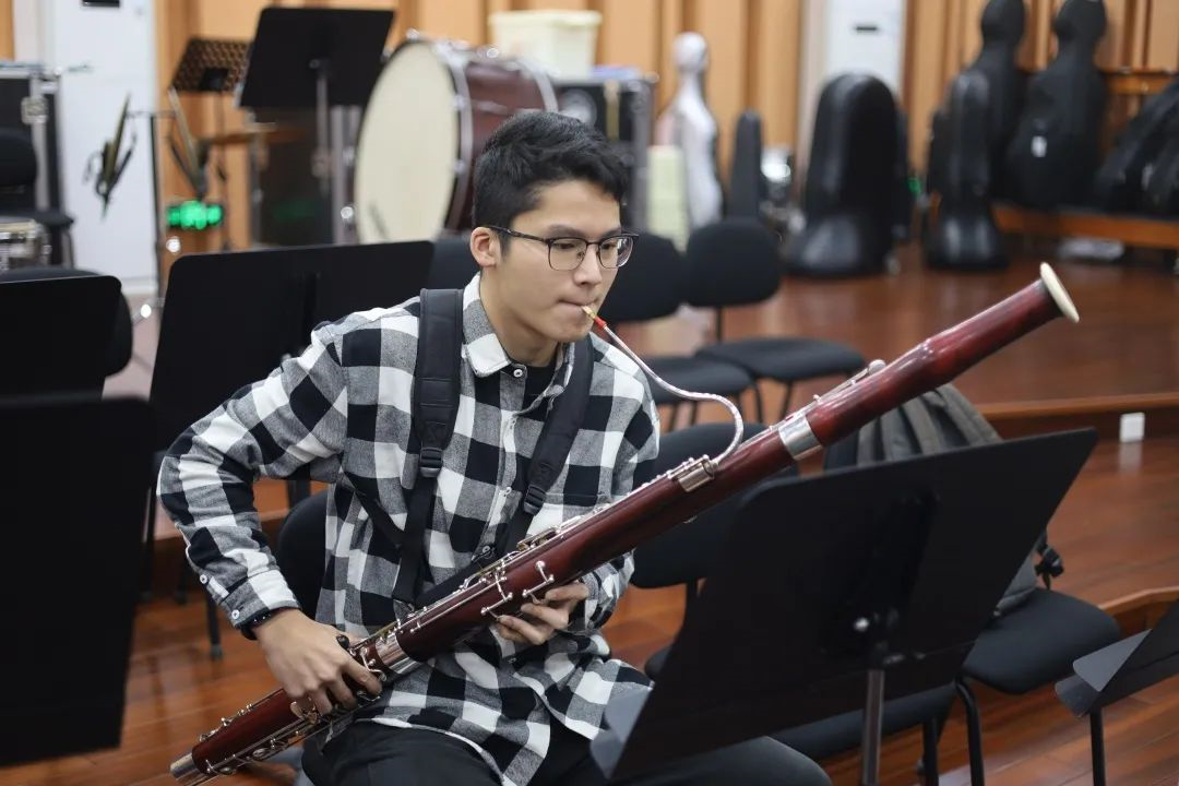 电气与信息工程学院2021级本科生孙奕玮正在吹奏大管。