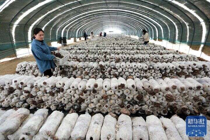 2月23日,在江苏省连云港市东海县曲阳镇陆湖村食用菌种植基地,菇农们忙着采摘平菇。新华社发(张开虎 摄)