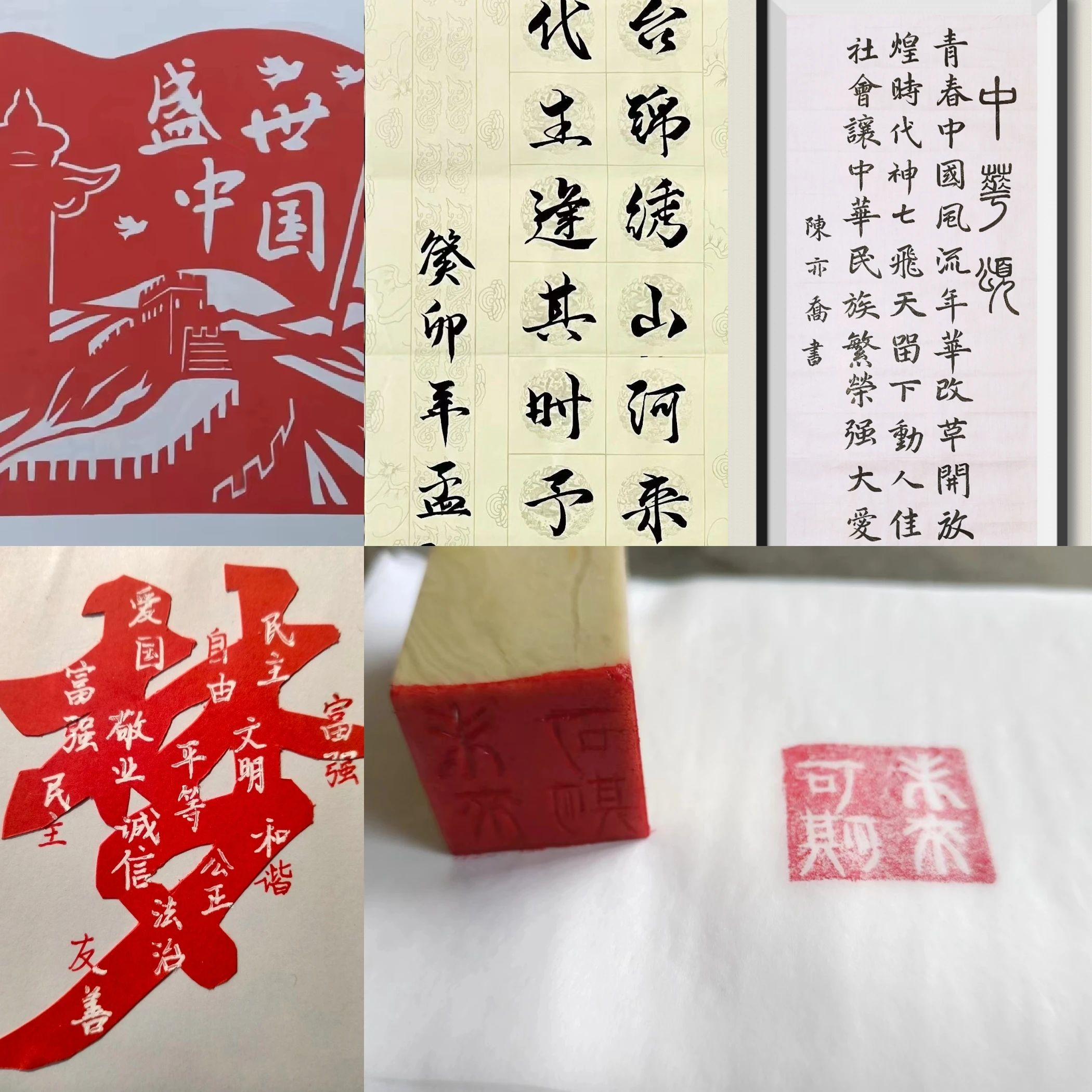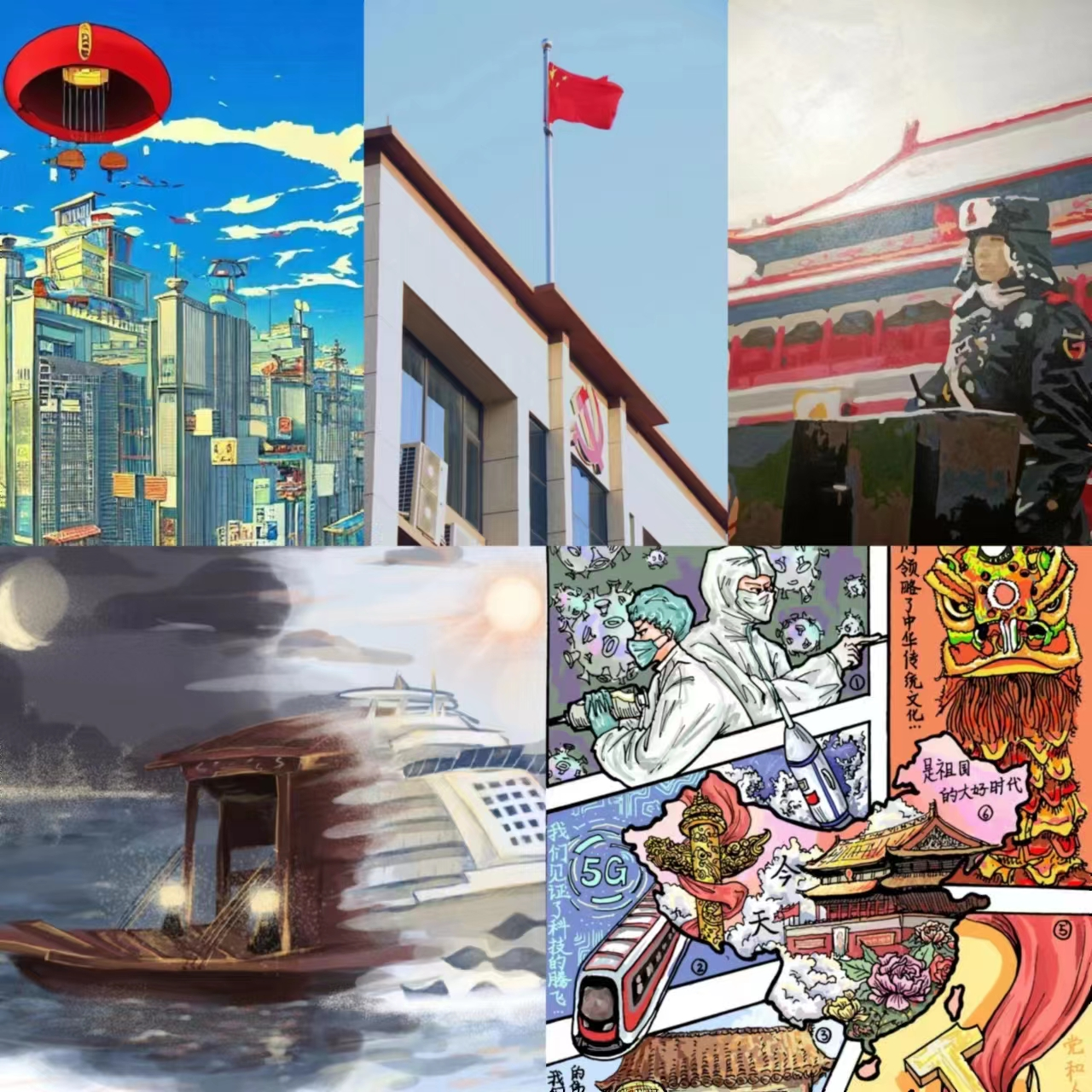 或是挥毫泼墨,将对祖国最诚挚的祝福倾注于笔尖;或是回忆来路风雨坎坷,展望前程辉煌璀璨;或是通过绘画的形式以哨兵的剪影展现一代又一代青年人的奉献;或是从5G、美丽乡村等不同侧面展示祖国的繁荣昌盛;更有同学另辟蹊径,通过AI绘画调整prompt遥望新时代图景;或是巧手慧心,通过刻纸,印章,剪纸等手工艺术“花样”献礼。摄影、立体书、管乐……多元的艺术形式是青年面对时代呼召的回应。