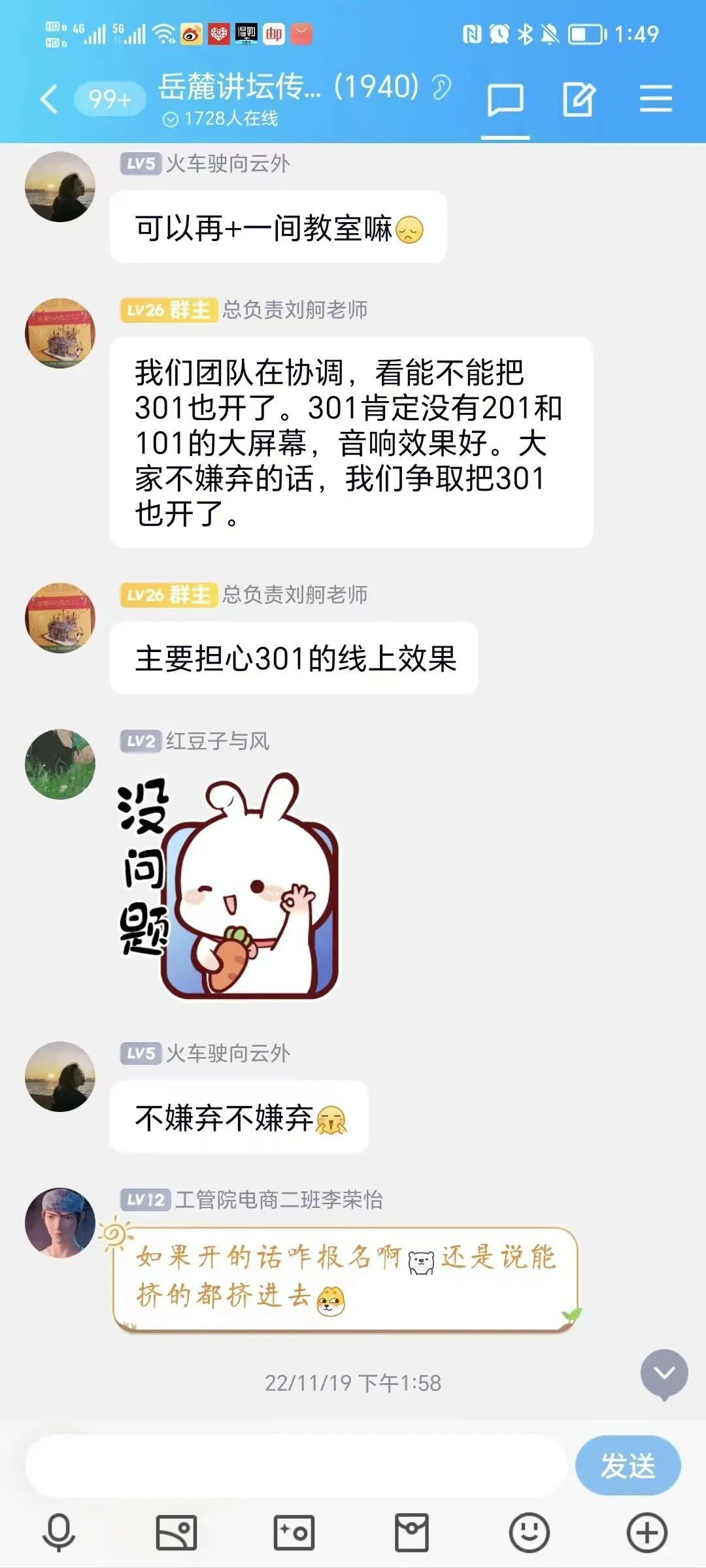 岳麓讲坛工作室学生负责人陈金娥说:“我们先后组建了18个QQ交流群,各群人数加起来接近10000人。刘老师会认真查看每一条消息并耐心回复。去年她留意到大家对罗翔教授呼声很高,便多方联系,协调和沟通了多次,终于成功邀请。”