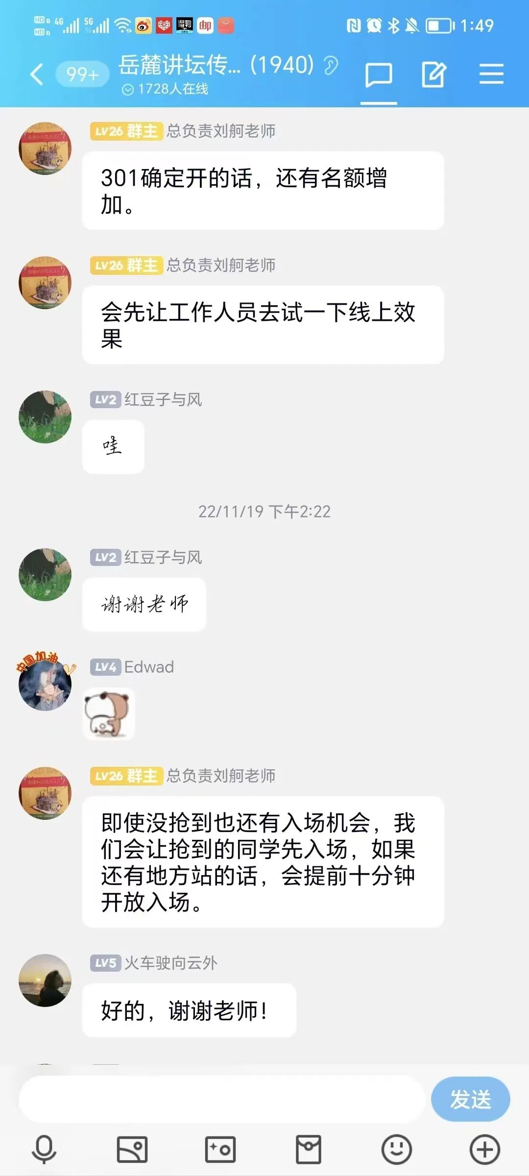 刘舸在岳麓讲坛QQ群里及时回复学生问题。