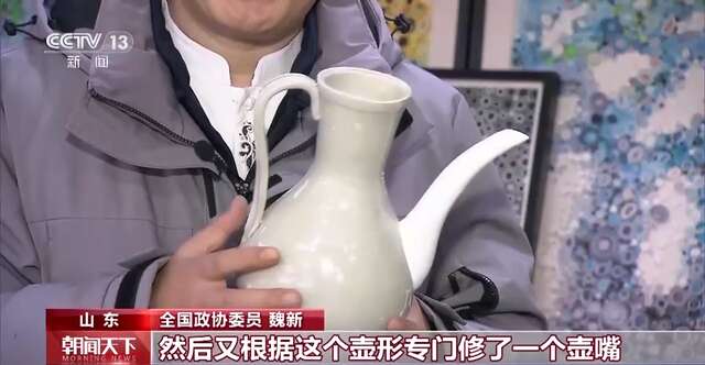 全国政协委员 魏新:你看我手上这件就是咱们文物修复专业的孩子修复的一件宋代的执壶,本来基本上全是残片的,(现在)不仔细看的话,这些裂痕基本上看不出来。然后又根据这个壶形专门修了一个壶嘴,1000年的时光碎片都被这些孩子们捡拾了起来,我觉得在做某些事上,其实残疾的孩子可能他更出色,他听障但是他眼睛更敏锐。从美术上来说,他可能对待色彩、对待立体的观察,包括对文物的这些细节,他可能比我们要更认真,更细致。