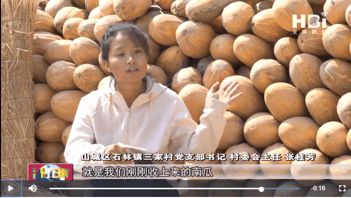 她向镜头介绍三家村通过种植南瓜,利用闲置资源增收致富,提升了整村的就业率。