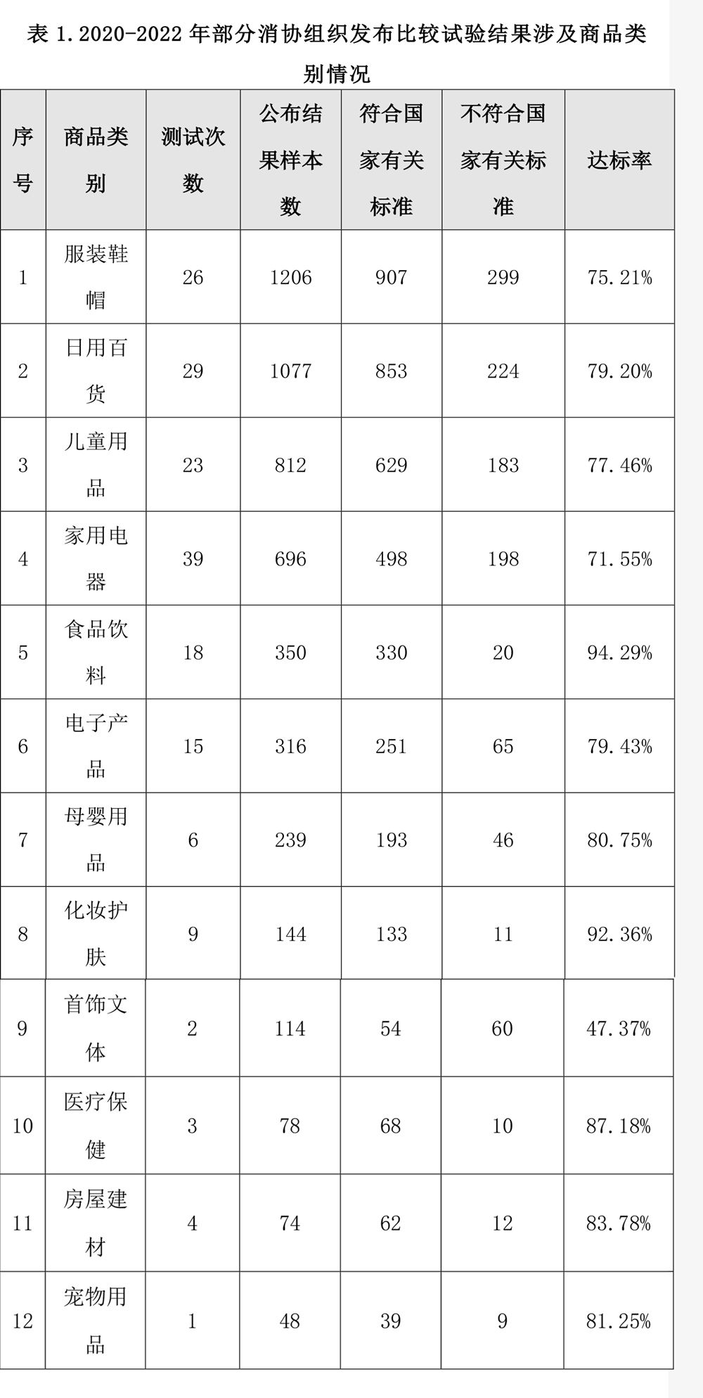 今年3·15期间,北京阳光消费大数据基于2020-2022年全国部分消协组织发布的比较试验结果,统计后得出:在5154个比较试验样品中,有4017个样品符合国家有关标准,占比77.94%。其中,首饰文体、家用电器和服装鞋帽类商品的达标率较低。