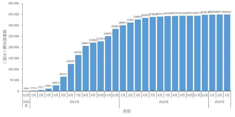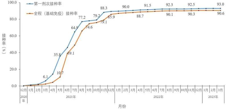 截至2023年3月23日,31个省(自治区、直辖市)和新疆生产建设兵团累计报告接种新冠病毒疫苗349346.5万剂次(图5-1)。接种总人数131044.9万人,完成全程接种127702.0万人,完成第一剂次加强免疫接种82760.6万人。全人群第一剂次、全程接种覆盖比例分别达到93.0%和90.6%(图5-2)。60岁以上老年人累计报告接种新冠病毒疫苗68044.0万剂次,接种总人数24170.2万人,完成全程接种23035.3万人,完成第一剂次加强免疫接种19305.6万人。