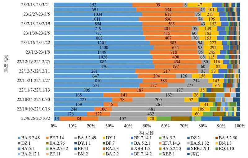 2.图中标记的数字分别为BA.5.2.48、BF.7.14、BA.5.2.49和DY.1进化分支有效基因组序列数量。