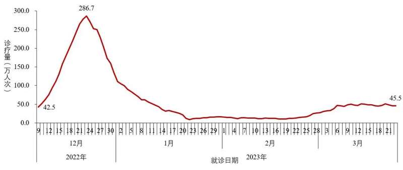 全国(不含港澳台)发热门诊(诊室)就诊人数于2022年12月23日达到峰值286.7万人次,随后连续下降;2023年1月23日后就诊人数呈现低位波动,近4周(2月24日-3月23日)在波动增加后呈现平台波动,3月23日为45.5万人次,较峰值下降了84.1%(图2-1)。