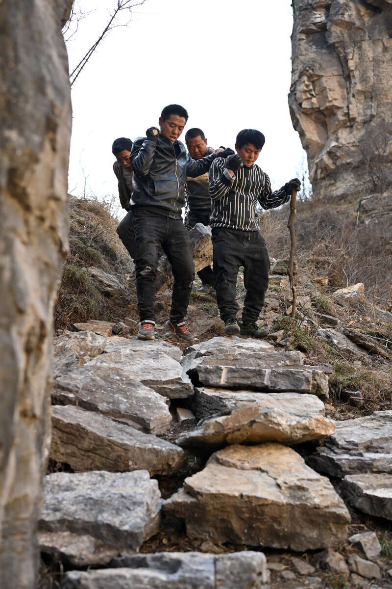 在山西省壶关县大峡谷镇青龙峡村的太行山上,村民挑着石块运往修路现场(3月7日摄)。